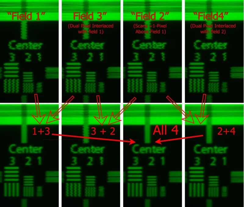 下图场周期1和3每隔一个垂直像素就会出现向左/向右移动1或2个像素,形成锯齿状的效果;场周期2和场4呈现锯齿状,与1和3的方向相反。