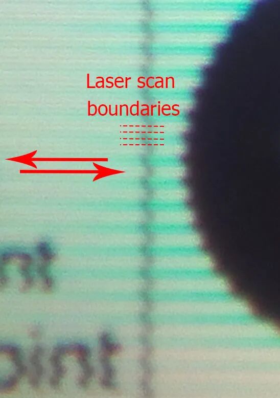 结合右上角图片来看,左边黄色椭圆形对应着“亮、暗、亮”的显示。而图片右上角也包括一个裁切的图像,其中显示器扫描线比图中距离更近,由此判断双激光发射器会在每侧明显会有1/3以上的重叠区域。