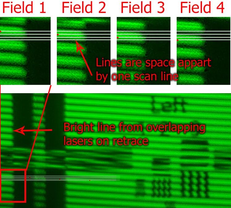 如上图,Karl找到四个场的最左侧并进行裁切放大,并加入4条白色水平参考线,而图中的绿色线条为一组扫描线的合成,在回扫过程中就会形成更大的激光器。