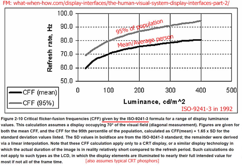 在1990年代,CRT显示器往往有200nit、约85Hz的非隔行刷新率,而HoloLens 2据表明有500ni最大亮度,下图是它的刷新率和亮度的示意图,可以其建议HoloLens 2在95Hz以上的非隔行刷新。