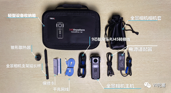 一体化方案包含设备收纳盒、全景相机、全景相机皮革套、电源适配器、9芯航空头RJ45转换线、千兆网线、延长杆、锥形散热器、保修卡。
