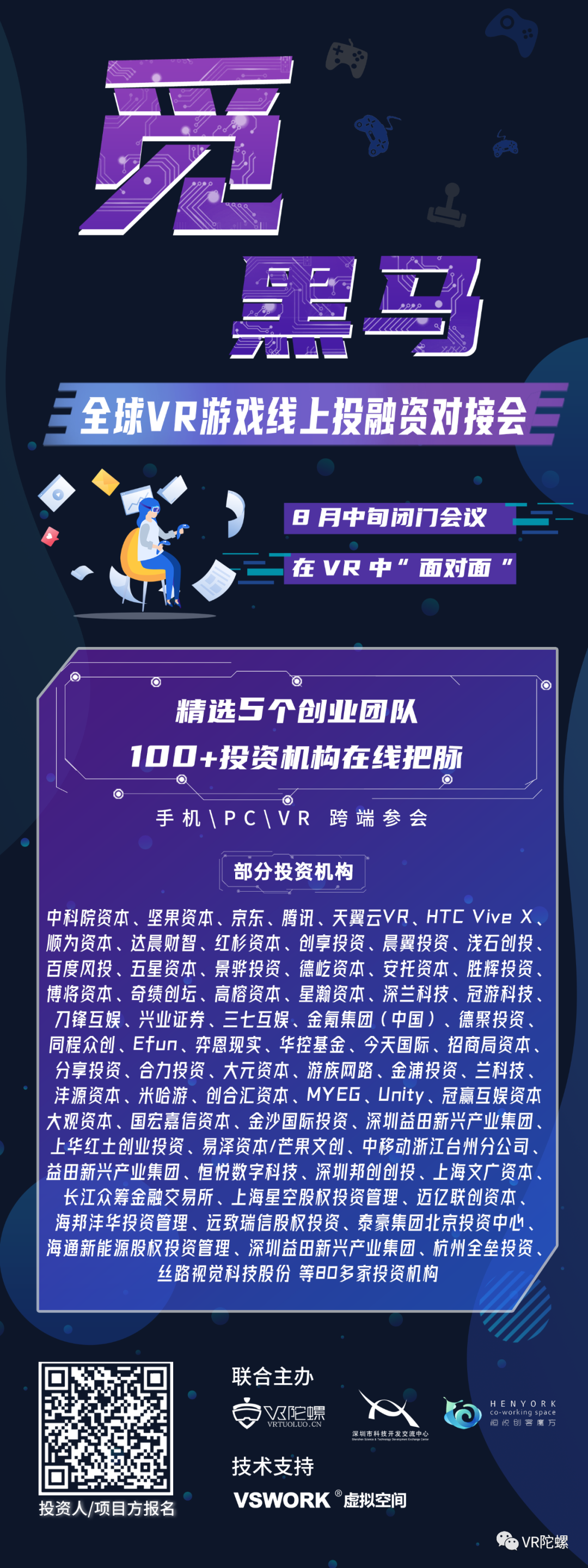 8月中旬,觅黑马·全球VR游戏线上投融资对接会将在VR中举办,此次主要针对VR游戏企业,提供资本对接、产品曝光机会,100+投资机构参与,可扫描下图二维码报名。