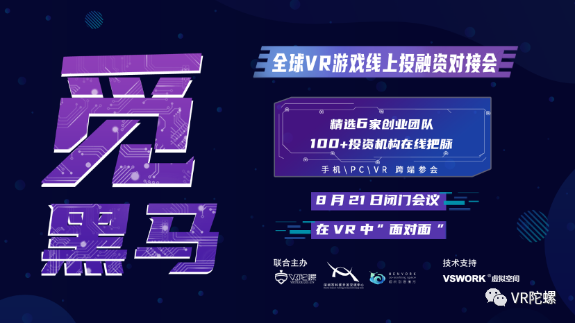 8月21日,VR陀螺第二届觅黑马.VR/AR项目线上投融资(VR/AR游戏专场)对接会圆满落幕。本次大会由VR陀螺、深圳市科技开发交流中心、恒悦创客空间联合主办,VSWORK虚拟空间提供技术支持,全程在VR虚拟环境中进行,支持VR、PC、手机跨端参与,同时,也在bilibili开启了同步直播。