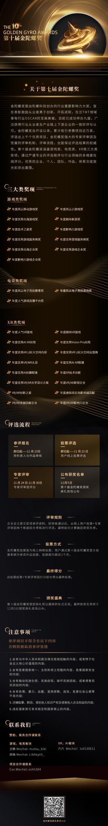 本届金陀螺奖设立游戏、XR和电竞三大类别,共30项细分奖项,旨在表彰和铭记在行业中勇毅前行的领航者,创新进取的从业者们。金陀螺奖愿与行业同仁一道,为每一位优秀前行者加冕,向每一份不懈的坚持致敬!