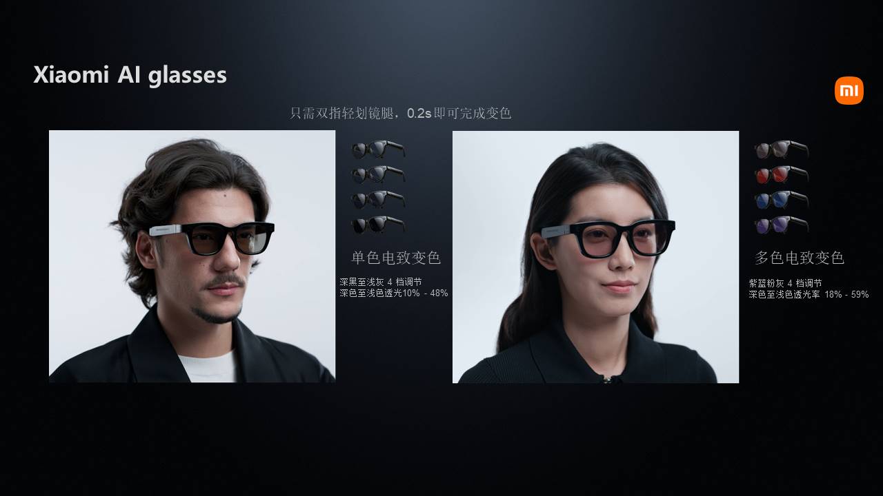 在第一代产品上,我们在被Ray-Ban打动的同时,也融入了自身差异化的理念,毕竟我们主要是面向中国区的市场,针对用户需求做了产品力的专项升级。首先,整机重量控制在40克,使用轻量化材料。其次,我们采用了电致变色镜片作为差异化亮点,支持多色变化。