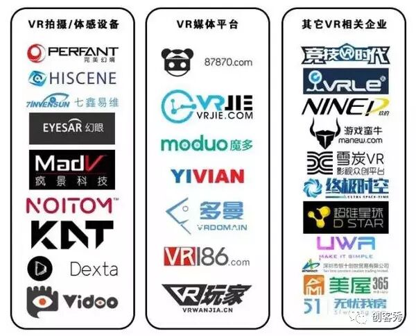 VR拍摄/体感设备: Insta360——企业级360°全景相机,可拍摄4K级全景视频和全景照片。广泛应用于旅游、房地产、新闻、体育赛事、大型活动等多个领域,突破传统视频固有限制,给用户360度全空间视角体验。全景视频支持全平台(手机、pad、web端拖动)观看,配合虚拟现实设备更能让用户产生沉浸式的体验感受。 幻眼——提供很先进的增强现实营销解决方案,定制开发属于企业的增强现实互动程序,或将增强现实添加到企业的移动应用里。 兹曼科技——创立于2009年11月26日,专注于虚拟现实领域,旗下品牌ZMER360°全景相机。 完美幻境——自主研发的智能算法平台推动了视觉成像技术的创新和变革,其核心技术涵盖了人工智能、机器视觉、三维重建、虚拟现实等领域。 亮风台——专注增强现实(AR)核心技术与产品研发,致力提供很自然人机交互服务、挖掘很深度数据价值人工智能公司。 KAT——KAT WALK是一款虚拟现实全向行动平台,亦称虚拟现实跑步机。它打破了虚拟和现实的空间限制,通过搭配包括Oculus Rift在内的虚拟现实头戴显示器使用,可以让使用者在现实极小的空间即可实现在虚拟世界中360°无限的行动。 疯景科技——于2015年4月成立,提供VR全景软硬件服务的公司,致力于打造设计一款高品质、简单易用的个人消费级360度全景摄像机。 诺亦腾——动作捕捉领域公司,研究领域涉及传感器、模态识别、运动科学、有限元分析、生物力学以及虚拟现实等,成立于2012年。 Dexmo——一款可捕捉手部动作并提供力反馈的机械外骨骼设备。在机器人控制和虚拟现实领域,Dexmo提供了一种人机交互的新方式。 微动——锋时互动旗下品牌,专注于人机交互核心技术发展。为客户提供完善的手势操控硬件\软件系统解决方案,在虚拟现实、增强现实、车载电子和智能家居等领域有广泛应用。 媒体: 87870——Oculus rift、虚拟现实技术、虚拟现实游戏、虚拟现实眼镜等虚拟现实内容网站,为国内虚拟现实交互、虚拟现实游戏开发、Oculus rift极客发烧友的VR部落。 VR界——虚拟现实一媒体,是中国很为专业全面的原创内容发布及交流平台,是虚拟现实用户、行业从业者的一内容获得渠道和产品发布先选平台。 魔多VR——为发烧玩家提供资讯、视频和应用,关注虚拟现实内容,让虚拟现实更好玩的娱乐内容平台。 YiViAn——汇聚国内外虚拟现实硬件资讯,虚拟现实软件内容资讯。 多曼——虚拟现实领域的媒体综合性服务平台。以“虚拟+”和“万物互联”为核心思想,致力于打造全方位虚拟化媒体平台和生产源。 VR186——虚拟现实新门户社区,提供虚拟现实资讯内容。 VR玩家网——致力打造国内VR玩家社区与VR资讯门户,为玩家提供设备测评与游戏测评服务,帮助对VR产品感兴趣的用户从零基础了解VR技术。 其他: 竞技时代——全球首家VR电子竞技平台。主营业务是自主研发VR电子竞技游戏,建设全球VR电子竞技体验渠道,主办全球VR电子竞技赛事。 Athletech竞技——专注于VR领域和新兴科技领域,致力于“科技,改变生活”的创新理念,“热情、专注、梦想、拼搏”是我们的团队精神。公司不仅拥有干练的营销队伍,丰富的渠道资源,而且同多家实力雄厚、技术精湛的科技网络公司进行密切合作,目前已拥有多项虚拟现实外设和技术,其中3D影视和3D游戏是我们的核心内容和关键技术,未来将发展科技化的虚拟现实应用领域。虚拟现实,想象,无所不及。 游戏蛮牛——国内很大的Unity3D专业视频学习平台,为国内开发者提供很新、很全、很快的视频学习教程。 玖的——广州玖的数码科技有限公司是一家从事虚拟现实(VirtualReality)技术研发和应用的高科技公司。全球头个VR商业落地解决方案9DVR体验馆,成功布局2,000余家加盟店,在VR体验店建设、运营及VR商用设备技术等领域具有领先优势。 雪炭STGMR众创平台——类似内容孵化器,做硬件是手段而不是目的。平台的初期目标人群是传统影视从业者,吸引其中的发烧友成为VR拍摄领域的准专业人士。 超维星球——超维星球孵化器打造3D互联网领域开放生态系统,联合中国3D产业联盟和3D世界智库,让整个资源集中在真正致力于商业价值创造的3D项目上。 侑虎科技——为游戏及虚拟现实开发者提供性能诊断与优化平台,以及技术咨询服务。 美屋三六五——国内一家虚拟现实家装公司,致力于为每个家庭打造一间“还原真实”的居所,从而可以摆脱现实世界中的空间和时间的限制,帮助每个家庭连接硬装、软装、家电、家政等产品和服务,从而打造家庭入口。 无忧我房——房地产VR平台,融合了VR(虚拟现实)、AI(人工智能)、房地产、互联网金融四大领域,以虚拟现实技术及独特的众筹产品,为用户创造“随时随地走进未来的家”之很好看房体验,以及全新的置业方式。 国外
