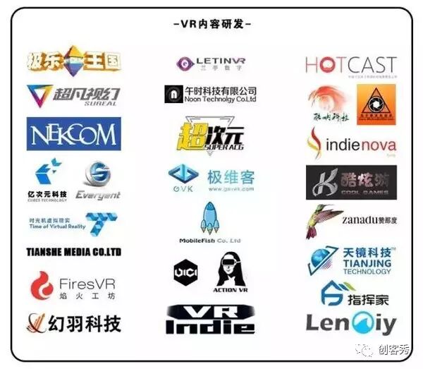 VR内容商: 极乐王国——于2015年4月24日正式上线,是国内一款正式上线营运的VR社交平台。 铃空网络——致力于制作VR虚拟现实游戏,成立于2011年10月,密室逃脱代表作《临终:罪人重生》。 幻维数码——上海广播电视台上海文化广播影视集团有限公司(SMG)旗下的成员单位。自从2000年成立以来,幻维数码始终秉承创意、品质、服务、发展为一体的经营理念,不断致力于创意、艺术与数字科技的融合与创新,累积了十年以上三维动画、视觉特效、媒体品牌创意与制作经验。 蓝鳍鱼——专心致力于制作VR虚拟现实游戏。VR游戏《重返地球》目前为止是VR游戏和整个暴风市场上下载量很大的游戏。VR二战题材游戏《太平洋风云》体验店陆续上货。 兰亭数字——隶属于北京兰亭数字科技有限公司,致力于空中VR影像内容的创新与实现,专注于高端VR影像内容制作的内容团队。 超凡幻视——专注于虚拟现实(VR)内容开发及行业解决方案的科技创新性企业。目前,公司正重点致力于打造沉浸式虚拟现实体验游戏开发。截至2015年11月,公司已经研发出“勇闯独木桥”、“The One”等一系列虚拟现实体验游戏。 幻羽科技——专心致力于制作VR虚拟现实游戏,代表作《幻》。 天舍(上海)文化传媒有限公司——专注于虚拟现实内容设计、开发及运营的公司,为各种领域的客户订制虚拟现实产品。 焰火工坊——成立于2014年10月,是中国很早深入研究VR技术的团队,基于对系统底层的深刻了解,在2015年4月推出了国内首款虚拟现实开发工具VRfires SDK以及焰火影院播放工具。 极维客——成立于2014年10月,专注于虚拟现实领域研发推广,集虚拟现实智能硬件设备研发、虚拟现实游戏、电影等产品研发、制作、推广于一体的虚拟现实软硬件公司。 TVR时光机——VR内容开发团队,代表作《Finding VR》。 ZANADU赞那度——是中国首屈一指的高端精品旅行预订网站,致力于品介全球很精彩度假和生活方式体验,为中国中高端新锐旅行者提供精品度假酒店及非凡旅程预订服务,用心打造世界上很美的假期选择,并提供领先潮流的时尚生活方式内容。 哒嗒网络——专业从事虚拟现实、增强现实、数字营销和云技术等领域的研发和运用,是虚拟现实场景设计和增强现实技术的方案供应商。 天镜游戏——专注于虚拟现实游戏开发及运营的互联网企业。公司成立于2016年1月,致力打造VR行业的现象级产品。 动鱼数码——成立于2012年3月,是一家基于移动互联网的互动娱乐产品、应用软件产品研发、销售的高科技企业。 上海无不维文化创意——研究全息摄影系统由近百台单反相机阵列组成,可达到千分之一秒以上的控制精度,瞬间获得360全息数据。所得的全息数据可进行视频特效VFX、三维建模等基础应用。 北京独立灵境科技——虚拟现实内容开发商,主要业务包括虚拟现实游戏开发、地产漫游定制、图书素材内容定制、虚拟样板间、视觉内容开发、体验馆项目定制等等。 凡聚——虚拟现实技术开发机构,虚拟现实技术应用解决方案提供者。 指挥家——虚拟现实设计、开发及制作团队。 午时科技——以虚拟现实数字视觉技术为核心,以创意文化产业为背景的综合服务型企业,专注于房地产、家居、三维交互、数字城市、虚拟现实游戏开发等专业,同时为展览展示提供基于交互技术产品的创意、研发和实施的整体解决方案。 广州创幻科技(超次元)——集研发与销售为一体动漫游戏公司。手机AR应用《超次元》,手机VR应用《超次元大舞台》以及手机游戏《超次元大乱斗》三款作品。 亿次元科技——VR游戏内容开发,为硬件商制定开发VR游戏,代表作《蜗牛冲撞》、《米米兔大冒险》。 酷炫游——成立于2012年6月,专门提供移动互联网应用开发与服务的高科技软件企业。主要从事手游产品的研发,发行,运营;还专注于新兴产业VR产品研发,VR产品内容提供商,工具制造商等。 热波科技——组建于2015年8月,专业从事VR全景视频影视节目制作公司, 2015年10月开始规模化制作VR影视内容,2015年11月制作并发行了国内一部VR室内情景季播剧《占星公寓》。 成都虚实梦境——专注于VR游戏研发。公司拥有自主知识产权的3D游戏引擎。 杭州点力网络——专注于VR游戏研发。代表作VR游戏《杀戮空间》、《AI镇》和《喋血逃生》。 上海酷呐科技——VR游戏开发领域,目前已经开发两款PC端次世代VR游戏,已经上线3glasses平台,被3Glasses选为S级内容供应商。代表作《逃离生化基地VR版》《坦克大战VR版》《巫妖王》。 清显科技——专注于虚拟现实及可视化技术研发的公司,致力于虚拟现实软件领域,拥有自主虚拟现实视频技术,同时为家装、房地产等行业提供线上vr服务。