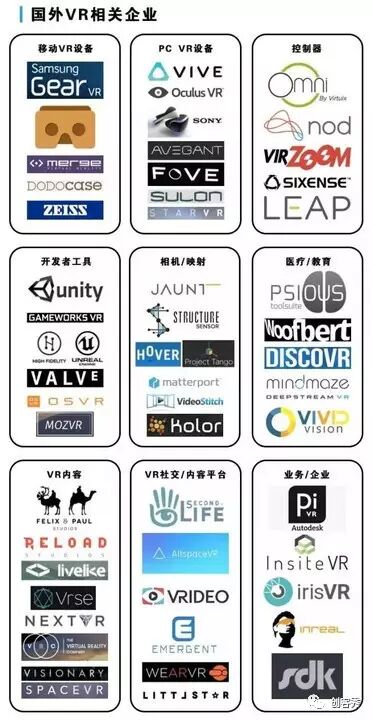 设备类 Oculus VR——很早VR设备生产商之一,被Facebook高价收购。 HTC Vive——与Valve公司合作联手推出SteamVR虚拟现实平台。 索尼PS VR——索尼旗下的虚拟现实(VR) 头戴式显示器,将兼容PS4虚拟现实平台。 Gear VR——三星旗下的虚拟现实头戴式显示器。 谷歌Cardboard——使用智能手机的低端虚拟现实系统。 StarVR——QHD分辨率和超宽视野的头戴设备。 Visbox——Cave展示系统(沉浸式CAVE投影系统 ,将整个屋子打造成虚拟现实)。 Fove——世界首款眼球跟踪VR头盔。 Sulon科技公司——一个同时拥有虚拟现实和增强现实的设备,在国际消费类电子产品展览会的平视显示系统类别中拔得头筹。 操控类 Virtuix Omni——是Virtuix公司开发的一款全向跑步机,配合Oculus使用。 Nod Labs ——VR操纵器和跟踪装置。 virZOOM——将静态的自行车当做VR操纵器,随着脚踏频率的加快甚至还可以飞行。 Leap Motion(厉动)——虚拟现实的体感控制器。 Oculus Touch手柄——由Oculus公司倾情打造。 Sixense——无线运动追踪操纵器。 Valve Controllers操纵器——由Valve公司生产,为HTCVive量身打造。 Cyberith——这款设备具有全向跑步机的功能。除此之外,它不仅可以让用户现场走路和跑步,还可以让他们旋转、跳跃、蹲伏、下跪甚至坐下。 Tactical Haptics——沉浸式游戏手柄。 ControlVR——使用你的双手和全身运动代替键盘来操控。 Pebbles Interfaces——开发手势追踪技术,被Oculus公司收购。 相机/3D投影技术类 Jaunt VR——专业级别的360度虚拟现实摄像机,支持全景拍摄,能将四周的场景全部录制下来,用来制作虚拟现实视频。 Otoy——用于创建、渲染、展示三维环境的全方位系统,由EricSchmidt(埃里克·施密特)和 AriEmanuel(阿里·伊曼纽尔)等众多互联网大佬担任相关顾问。 Structure.io——通过智能手机捕捉3D全景。 hover.to盘旋——通过智能手机制作3d模型。 Kolor——将2D图片和视频转制成3D文本。已被GoPro收购。 VideoStitch视频拼接—VideoStitch注于开发视频拼接软件,用于实现直播虚拟现实。 Matterport金色港湾——在虚拟现实中重建真实世界环,还原真实景象。 Panorics——开发完全沉浸式360度视频技术和产品。 开发者工具类 Unity——开发平台,支持虚拟现实的开发。 Unreal Engine——游戏开发平台,支持虚拟现实。 WorldViz——开发Vizard VR工具包。 GameWorks VR——由NVIDIA(英伟达公司)提供的开发者平台。 OSVR——为虚拟现实提供的开源硬件和软件平台。 High Fidelity——部署VR空间的开源软件,由“第二人生”创始人Philip Rosedale(菲利普·罗斯代尔)创立。 内容类(制作虚拟现实体验/游戏) 为从事VR游戏开发的工作室 Insomniac Games——成立于1994年的游戏工作室,基于Oculus研发VR游戏。 Ubisoft——老牌游戏厂商,代表作有《刺客信条》,15年11月发布一款VR游戏《鹰击长空》(Eagle Flight)。 CCP——《星战前夜》(EVE)开发商,研发共享世界观的VR游戏Gunjack。 Gunfire games——由Crytek前CEO创立,将推出VR游戏作品Chronos, Herobound: Spirit Champion, “Project X”。 4A Games——《地铁2033》开发商,位列Oculus首批游戏开发者名单。 Carbon Games——VR游戏作品AirMech。 Climax——VR游戏作品Bandit Six。 Harmonix——《摇滚乐队》系列开发商,位列Oculus首批游戏开发者名单,已知作品Harmonix Music Visualizer VR(Sony Morpheus独占)。 High Voltage Software——1993年成立,主要开发主机游戏。 Ready at Dawn——《战神》(God of War)系列开发商,正在为Oculus开发独占游戏。 Otherworld Interactive——VR游戏作品:Nimbus Knights(HTC Vive独占)。 Square Enix——VR游戏作品:Hitman: Go(三星Gear VR独占)。 Totwise——VR游戏作品:The Hum: Abductions。 从事VR虚拟体验开发的工作室 Reload Studios——制作VR游戏的独立工作室。 nDreams——专做VR游戏开发。 Visionary VR视觉虚拟现实——一个主管技术和内容开发的工作室。 NextVR——负责捕捉、和提供实时直播和按需的虚拟现实体验(音乐会,电影,体育)。 The VR Company——提供虚拟现实体验的工作室,史蒂文·斯皮尔伯格担任顾问。 VRse——为电影制作而创办的虚拟现实内容创作基地。 Livelike VR——专门直播体育赛事的虚拟现实生产商。 spaceVR——体验太空飞行的感觉。 Felix& Paul Studios(费利克斯和保罗联合工作室) ——生产虚拟现实内容,好莱坞特效大片御用生产虚拟现实内容制作商。 社交网络/内容平台 Littlstar——虚拟现实内容集成。 Wear VR——为虚拟现实体验而开发的的内容平台和应用商店。 AltspaceVR—提供在虚拟现实中与网上其他人互动(各种节目、演唱会、电影)的体验。 Vrideo——提供VR体验的Youtube。 EmergentVR—用户原创的虚拟现实内容。 教育 Woofbert——提供虚拟现实平台上的艺术教育。 zspace—为STEM(科学、技术、工程、数学)学科教育提供的虚拟现实平台。 Discovr——通过虚拟现实技术探索远古时代。 drashvr——开发教育类的虚拟现实应用。 医疗 Psious—使用虚拟环境来治疗焦虑症。 Deepstream VR—利用虚拟现实技术进行康复治疗和疼痛管理。 MindMaze—为医疗康复提供虚拟现实体验环境(如中风)。 Vivid Vision—用虚拟现实游戏矫正弱视、斜视。 商务/企业工具 insiteVR——为虚拟现实服务的设计工具。 IrisVR——为虚拟现实服务的3D模型制作工具。 SDK Lab——提供虚拟现实体验,用于员工培训(采矿、钻井等)。 Inreal Technologies——为建筑设计提供的虚拟现实工具。 Autodesk——正在进行